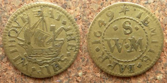 The above brass farthing measures 16.4 mm and weighs 1.12 grams. It was issued in the name of a Mr. W. S. & Mrs. M. S. who traded at the sign of the Ship (presumed to have been a tavern) in the Temple Bar Without district of Westminster in 1649. This makes it one of the earliest farthings to be issued in the 17th Century token series.