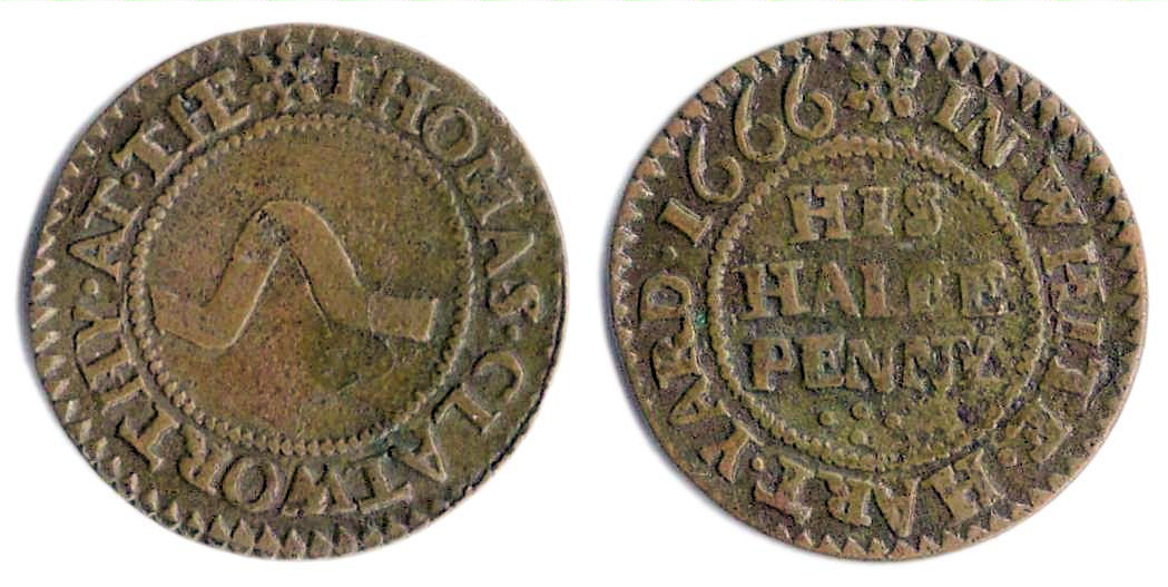 The above copper half penny measures 21.0 mm and weighs 2.59 grams. It was issued by Thomas Clatworthy at the sign of the Crooked Billet (i.e. a crooked stick) in White Hart Yard in 1666.
