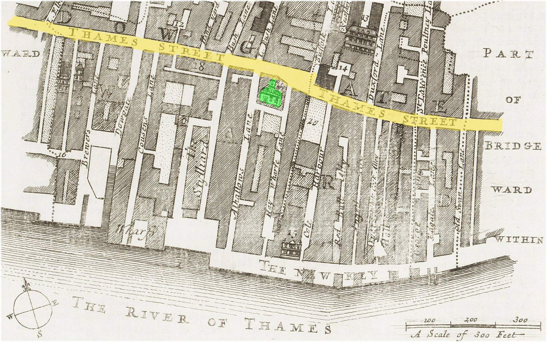 Thames Street was an important and very long thoroughfare which ran parallel to the warehouses, homes and other buildings on the north bank of the Thames between the Tower of London and Puddle Dock (south of the West End of St. Paul’s Cathedral).