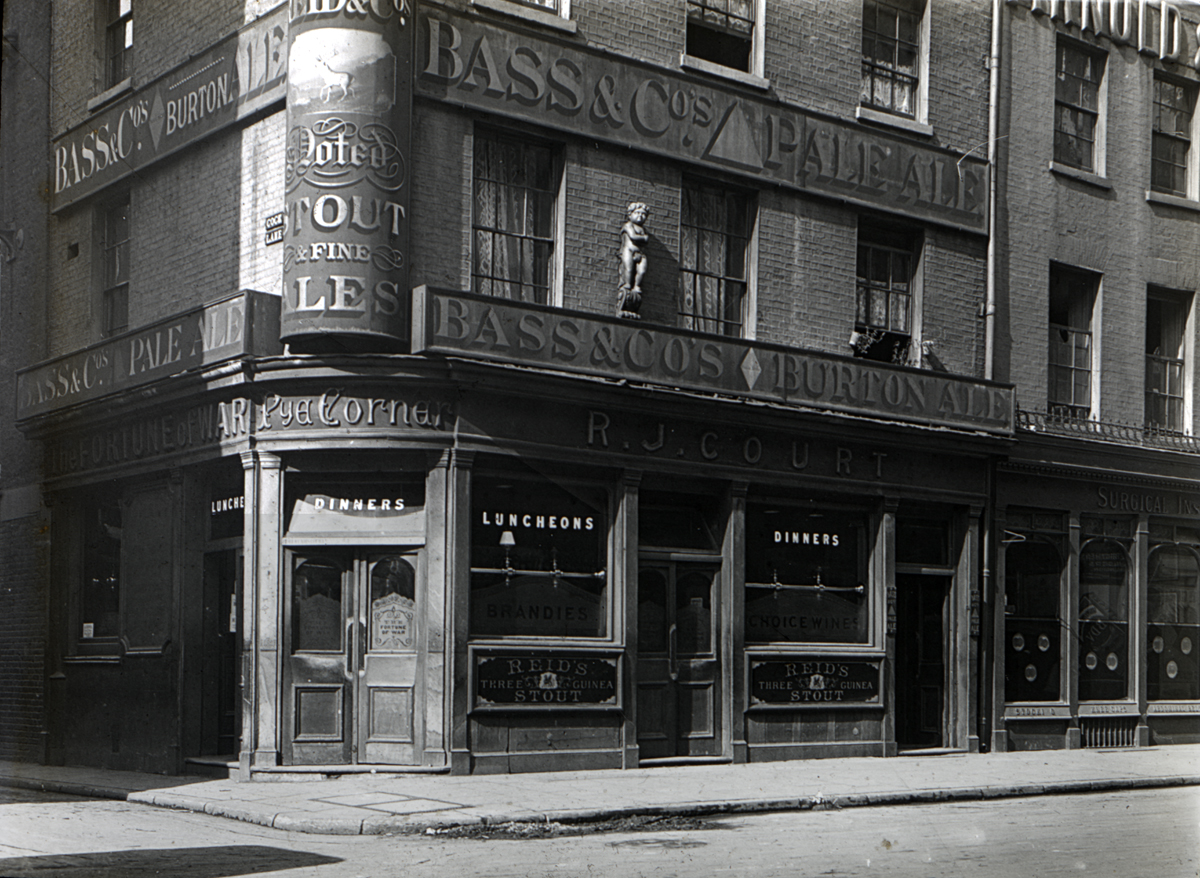 The Fortune of War Public House at the corner of Cock Lane and Guiltspur Street prior to it demolition in 1910 – Note the position of the Golden Boy of Pye Corner statue in its upper wall