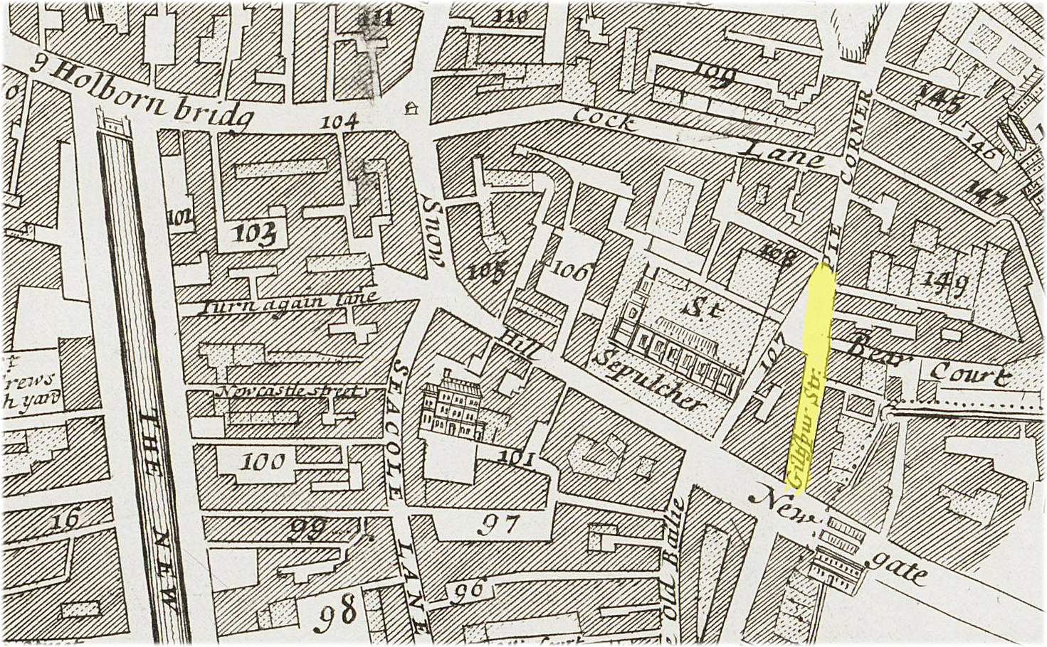 In mid-17th century Giltspur Street was located immediately to the north-west of the Newgate entrance to London. Newgate was one of the city’s ancient fortified gates. It was located on the north-west perimeter of the old city walls in the Farringdon Ward of the city.