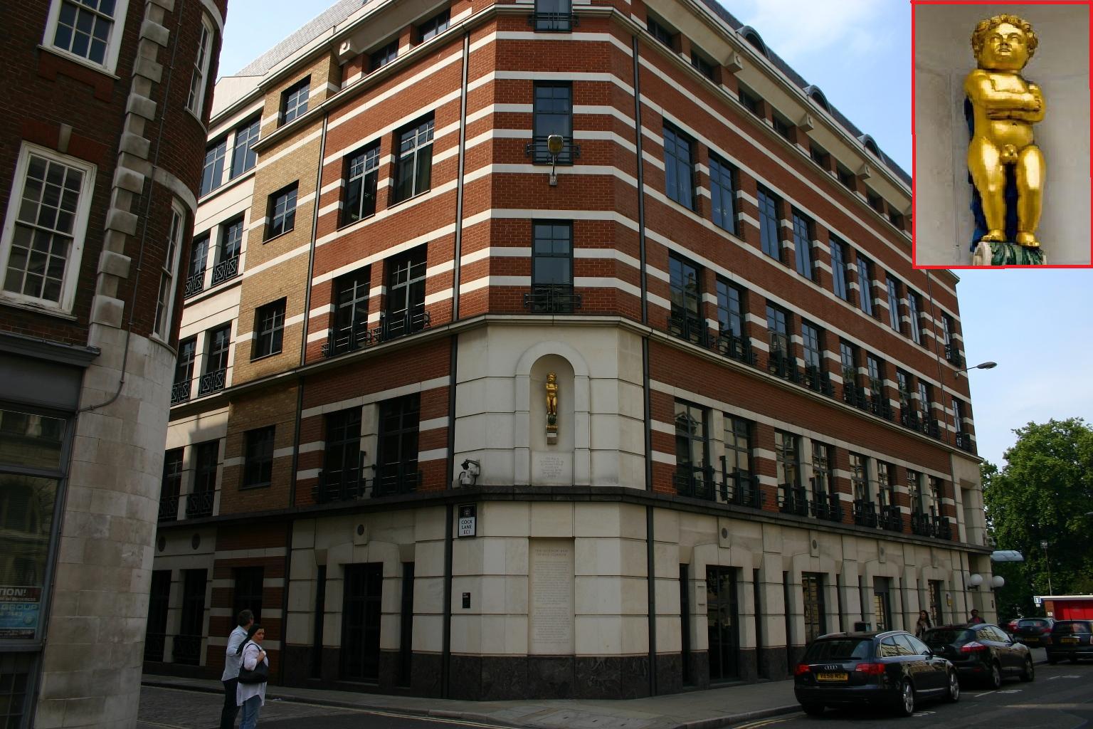 The statue of the Golden Boy of Pye Corner at the corner of Cock Lane and Giltspur Street – Detail inset top right