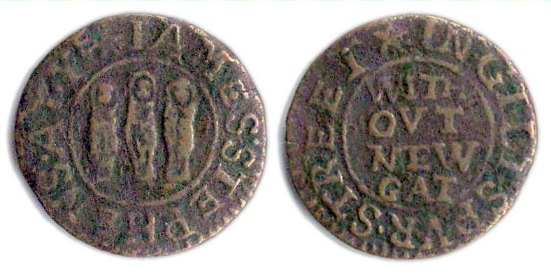 Obverse: (star) IAMES. STEPHENS. AT. YE, around a solid line circle, within the depiction of three nuns standing in a line facing.