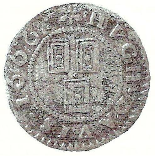 The obverse of a penny token of 1666 issued by Hugh Davies, Stationer at the sign of the Three Bibles in Holyhead, North Wales