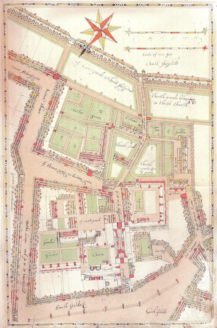 West Smithfield, London. (c.1720) showing the Parish church of St Bartholomew the Less (above Well Yard – No.144) and St Bartholomew’s Hospital (No.144)