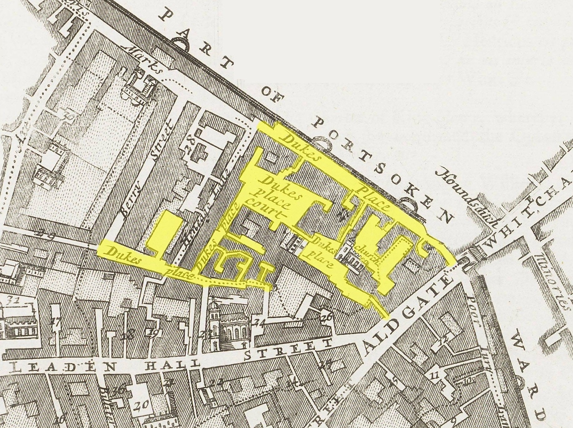 It is not clear where John Epsom and his family were living at this time but it was presumably within the parish of St. Helen’s, Bishopsgate (Note 3). The eastern boundary of this parish runs alongside the Aldgate Ward of the city and as such is in very close proximity to Duke’s Place, the location of John’s business premises as noted on his trade token issued in 1667.