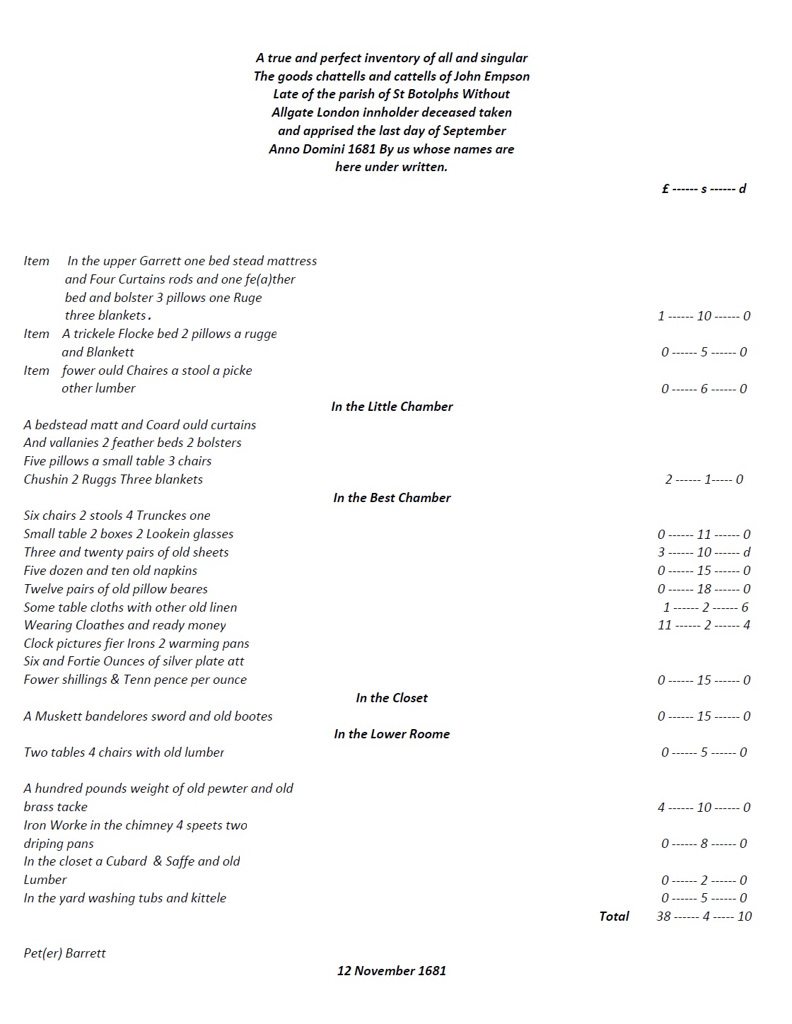 - An inventory of John Empson’s home at the time of his death in 1681. This dwelling was located in the parish of St. Botolph Without, Aldgate, possibly in Swan Alley off the Minories.