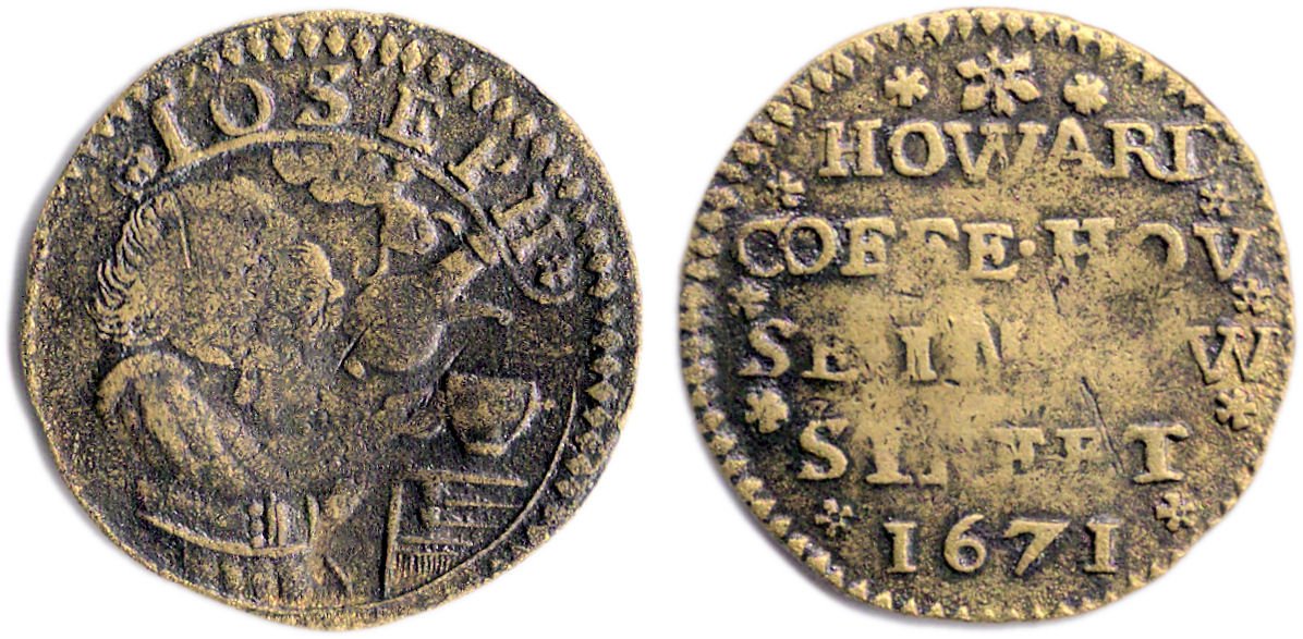 Approximately 80 different coffeehouse tokens were issued in London during the period 1663 to 1672 with the majority (at least 50%) of them being attributed to the brief period 1669 to 1671(2). Nearly all of them were valued at either a half penny or penny. The comparative large size of Joseph Howard’s token suggests it to be of a penny denomination. Penny tokens appear late (i.e. post 1668/9) in the issuing series of mid seventeenth century tradesmen’s tokens which extended from 1649 to 1672. This example is clearly dated 1671.