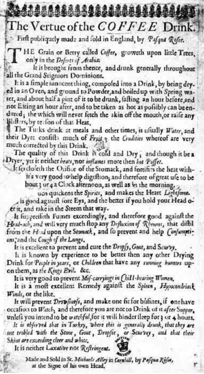 Rosee proved to be a shrewd businessman and popularised his new business by issuing printed handbills that which made some extravagant medicinal claims about the new wonder drink, “coffee”. He claimed it helped cure hangovers, cured dropsy, gout and scurvy, helped prevents miscarriages and even facilitated the breaking of wind!