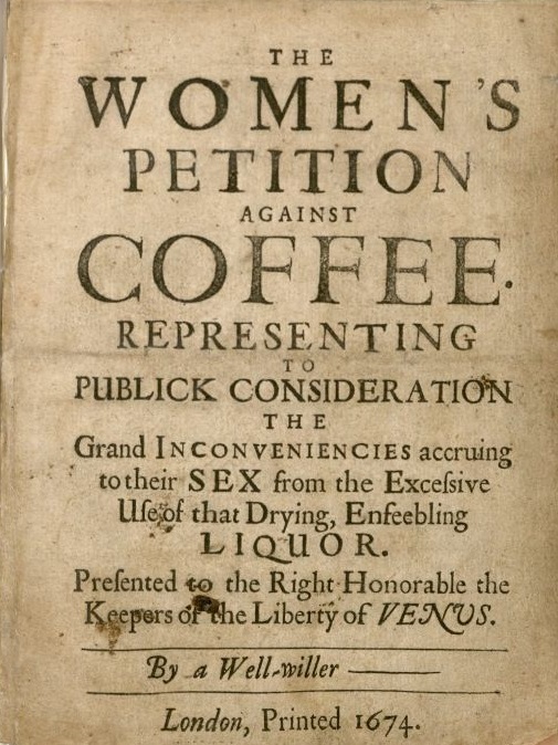 However, not everyone was in favour of the new wonder drink or the almost exclusively male establishments from which it was sold. Those that lived close by to coffeehouses often complained about the continual polluting smell of beans being roasted. Tavern keepers were also raised apposition to the new coffee houses as they threatened their business. One contemporary satirical poem referred to coffee as “syrup of soot” or “essence of old shoes”. Many women also objected to the amount of time their husbands spent in the new “penny universities”. In 1674, a pamphlet entitled “The Women’s Petition against Coffee” was published in which it was said that coffee, “made men as unfruitful as the deserts whence that unhappy berry is said to be brought”.