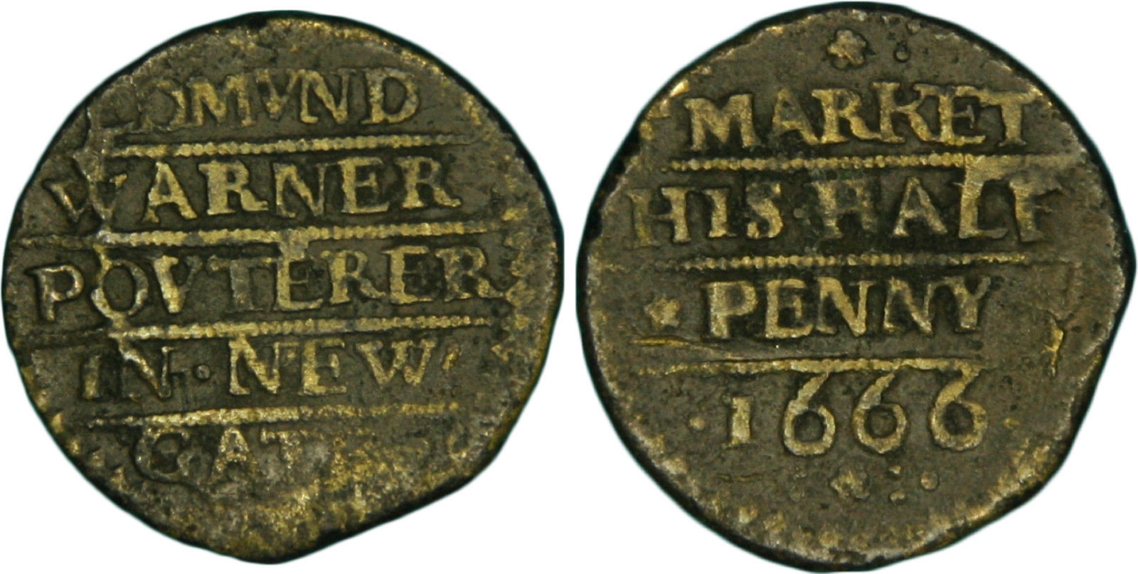 1) An almost identical token in terms of style, design, trade sign and issuing location to that described above for Ralph Butcher was issued in the name of Henry Slater in 1667. It is unclear if Henry operated from neighbouring business premises to Ralph Butcher, thereby qualifying him to use the same trade sign, or if he took over those formerly occupied by Ralph in 1666.