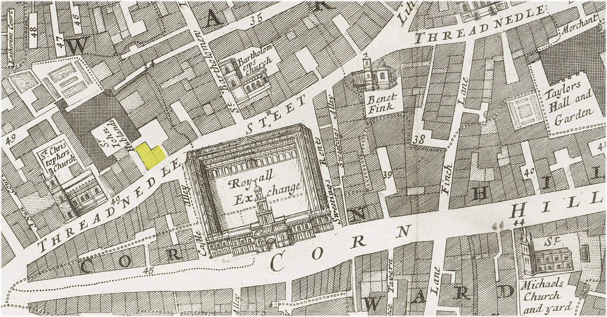 The location of the Crown tavern in Threadneedle Street (London) opposite the Royal Exchange (c.1720)