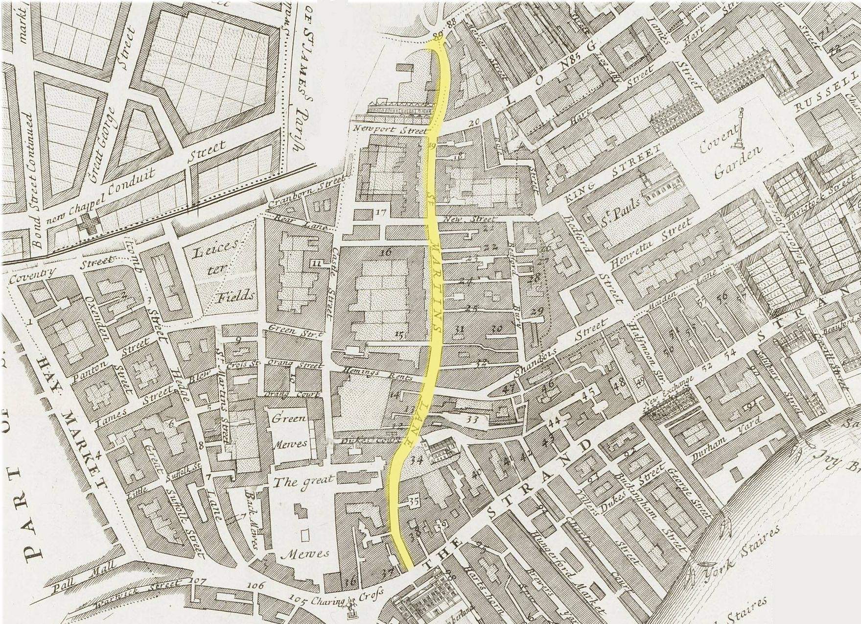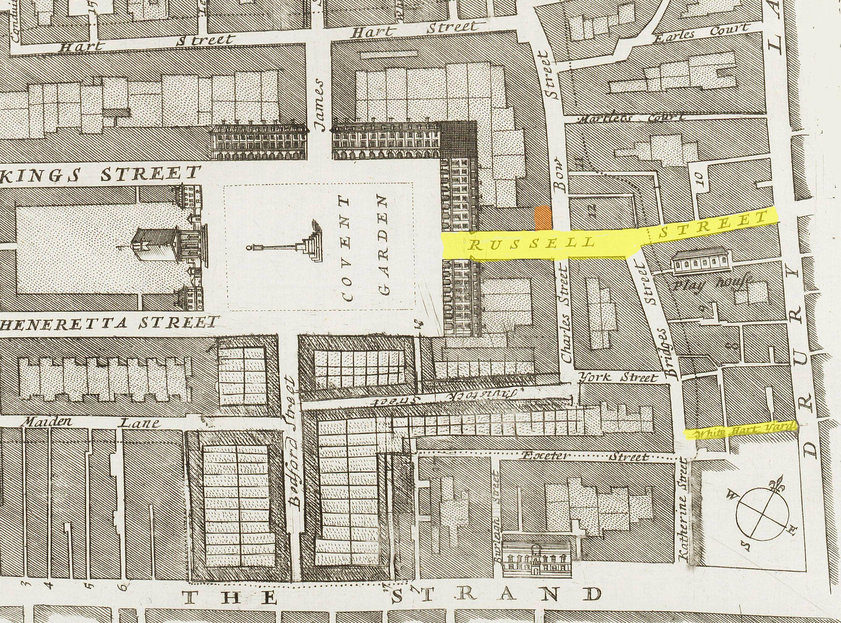 A map of the Covent Garden area (c.1720) showing White Hart Yard and Russell Street plus the location of the Goat Tavern (in red)