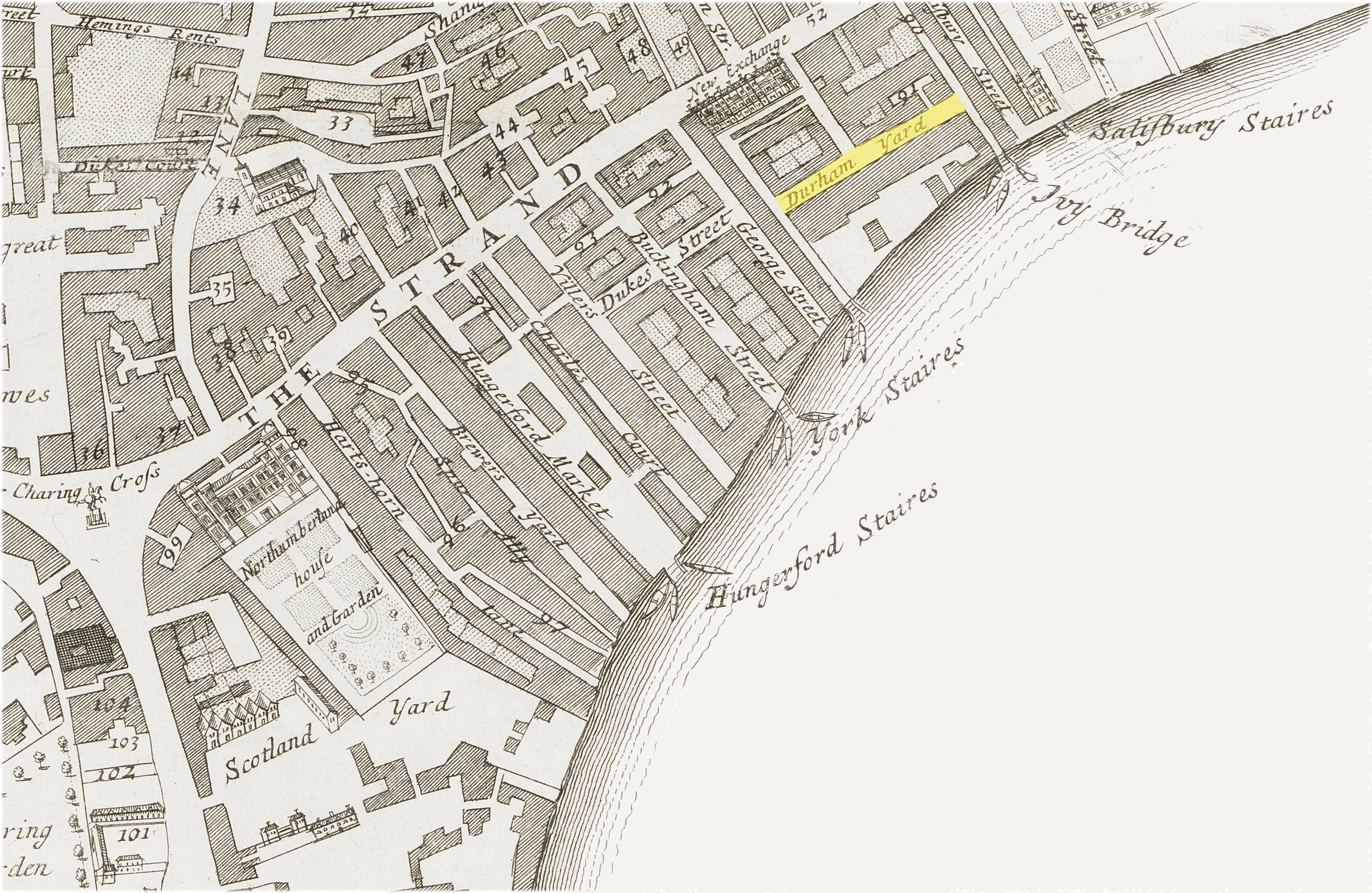 White Hart Yard no longer exists in Westminster’s modern street plan. It ran to the south of, and in a parallel alignment to that of, today’s Tavistock Street along the stretch leading into Drury Lane. Its course is now lost under the Waldorf Hilton Hotel.