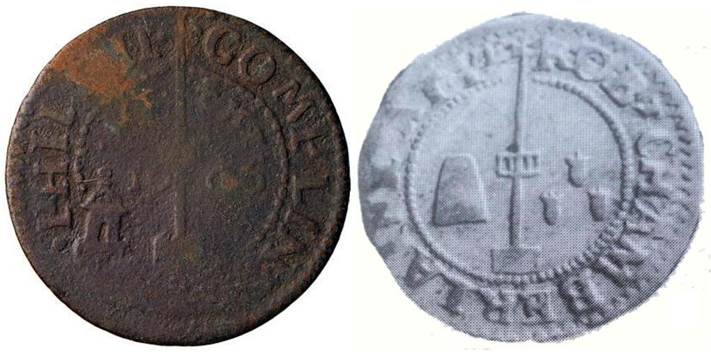 The central obverse detail of Humphrey Vaughan’s half penny token compared with that of a coal seller from a mid-17th century copy of “The Cries of London”. The latter could possibly have been the die sinkers source for the former token design.